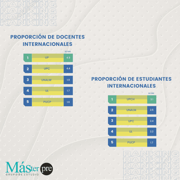 En el Perú, la Universidad del Pacífico (UP) ocupa el primer lugar en la métrica proporción de profesores internacionales y la Universidad Peruana Cayetano Heredia (UPCH) el primer lugar en la métrica proporción de estudiantes internacionales del ranking QS.